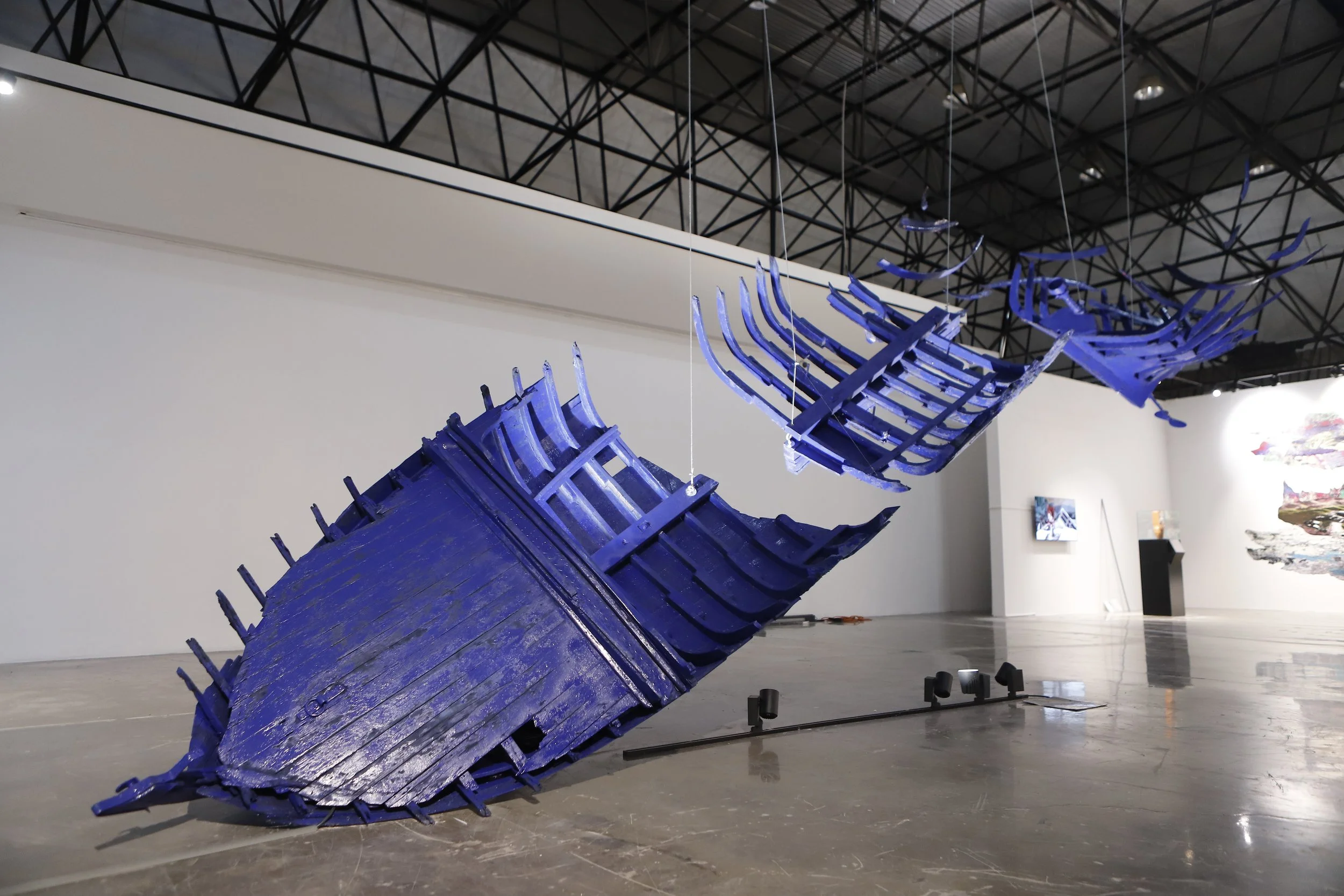 Le bleu Noé créé pour l’œuvre, n’est pas sans rappeler les couleurs de la terre promise de toutes les âmes perdues en mer : l’Europe. Si la responsabilité de la rive sud dans l’explosion du phénomène migratoire est évidente, l’œuvre rappelle celles qui engagent la rive nord. Ainsi, les responsabilités de cette ‘’Harga’’ de masse engagent non pas un pays ou un autre, mais tout le bassin méditerranéens.